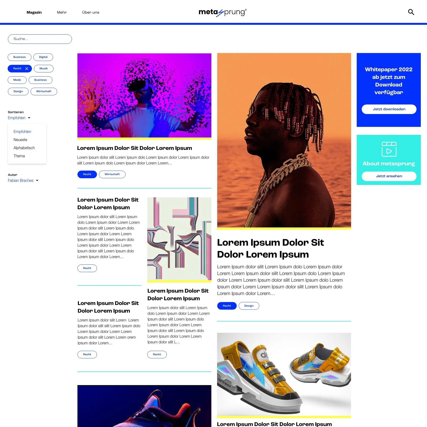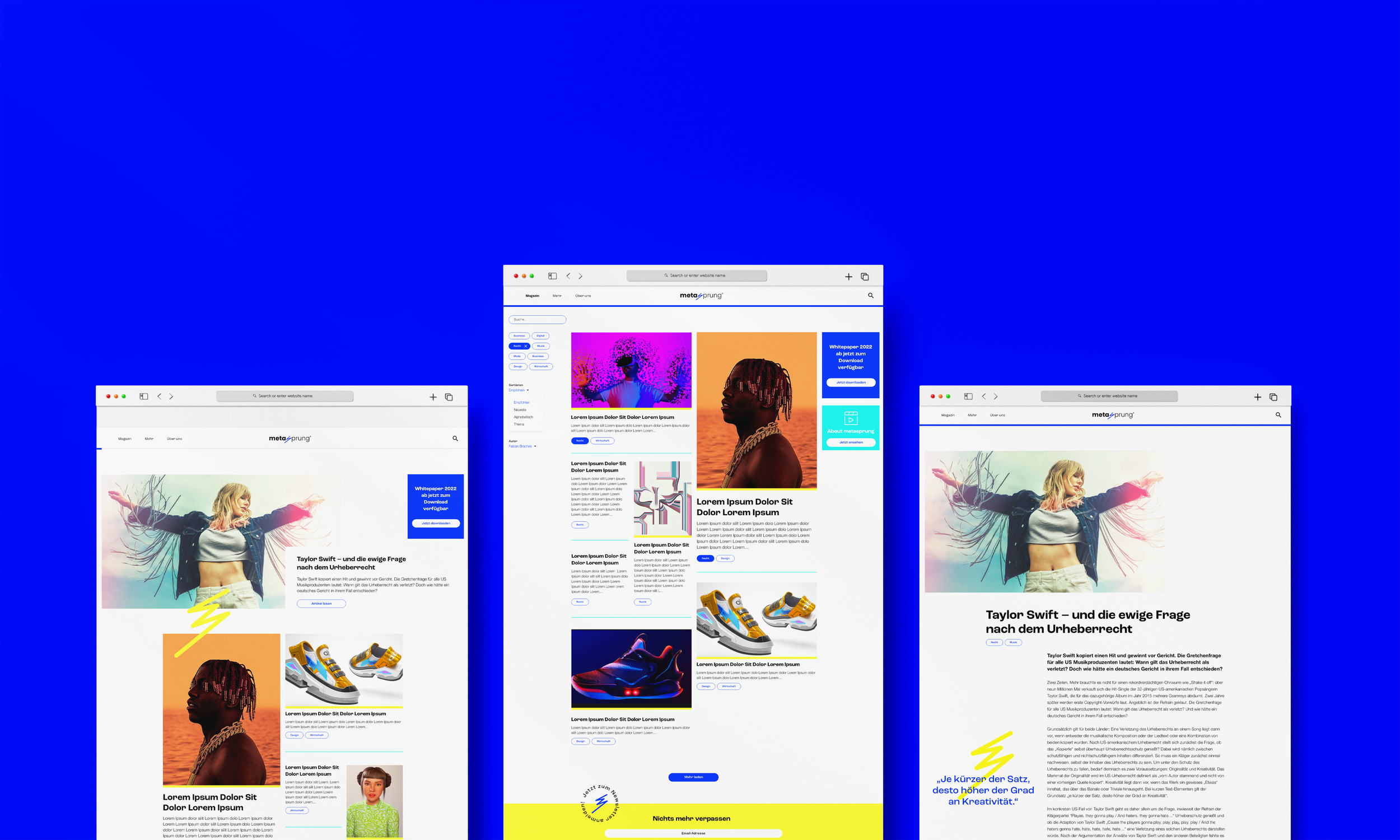 Branding und Webdesign für das Online-Magazin metasprung. Bei metasprung wird Fach- und Führungskräften aus den Bereichen Medien, Marketing und Kommunikation Fachwissen zu Rechtsthemen aus der Hollywood-Branche vermittelt. Das Design ist den Themen entsprechend "rebellisch" und "laut". metasprung schafft den Sprung von der Wissensvermittlung auf juristischer Ebene auf die nächste Metaebene mit Beratung und Deep Dive in die Fachthemen und ist damit ein echter Newcomer im Online-Business.